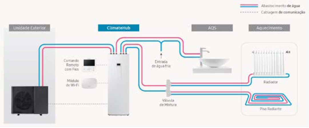 em calor interior através de radiadores, piso radiante e água quente.
